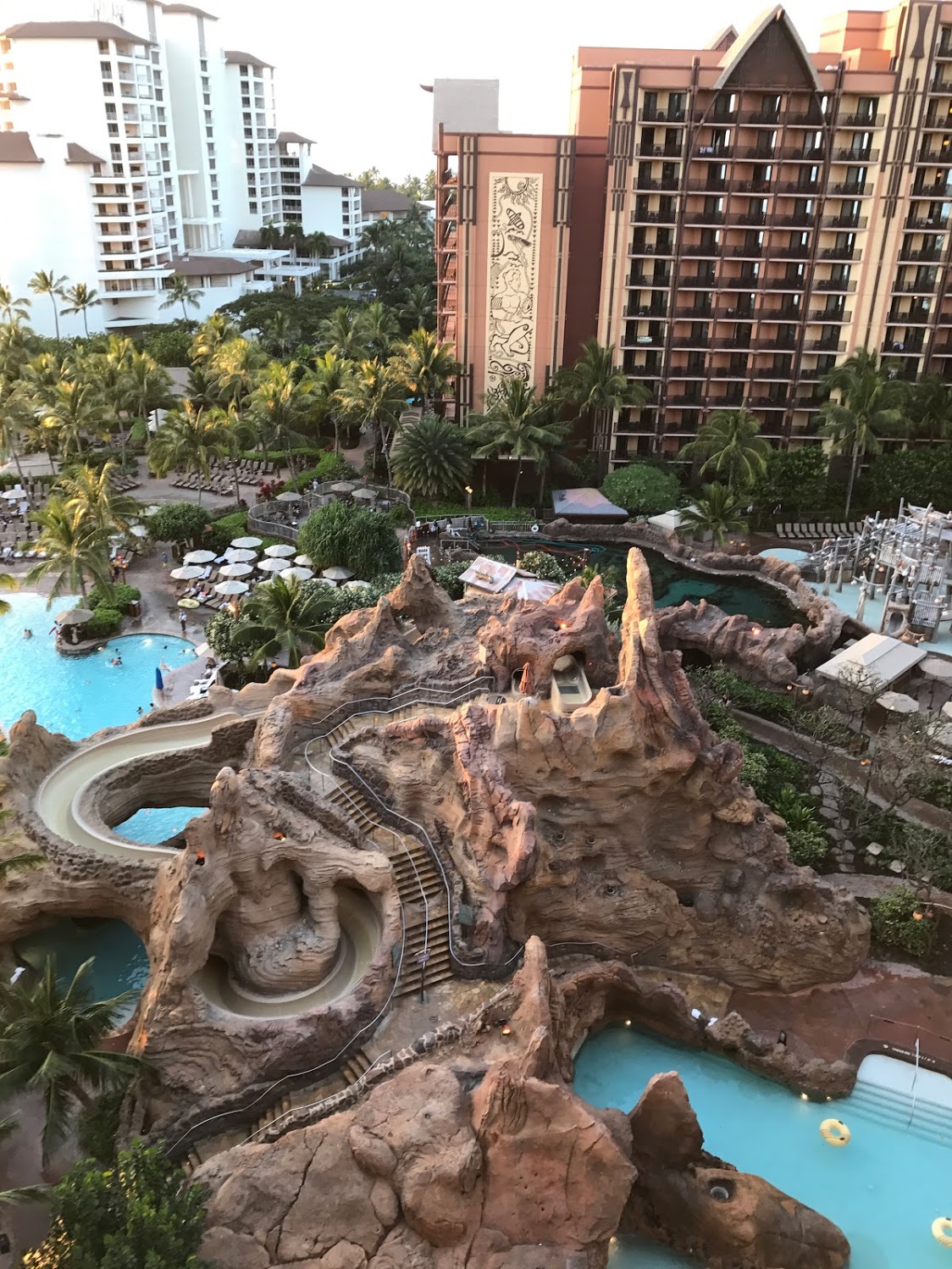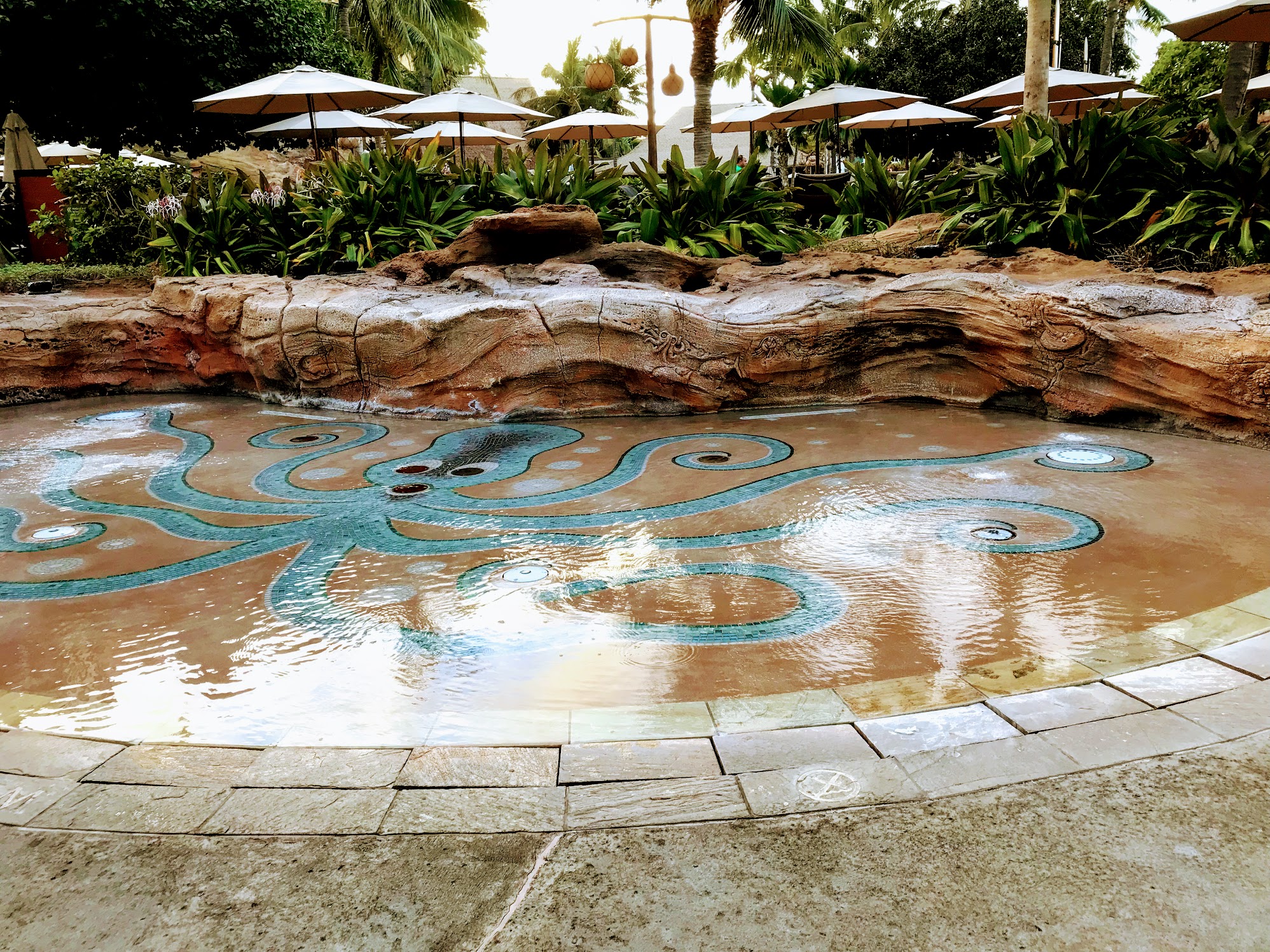 The swimming complex at Aulani consists of three main pools (one of which is an adult-only pool), two slides, a lazy river, three all-access hot tubs, one adults-only two-tiered hot tub, a children’s mini splash park structure with slides, a toddler’s splash zone, and the beach. There’s also a pool full of fish you can snorkel with for an extra fee. While pool opening and closing hours vary seasonally, many of the swimming pools start opening at 8AM, with all of them fully opened by 9AM. For closing, the last pool is typically shut down by 8PM.