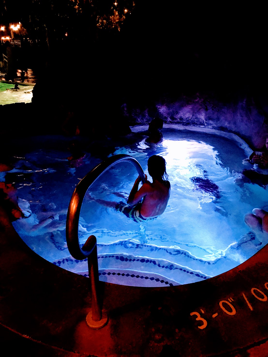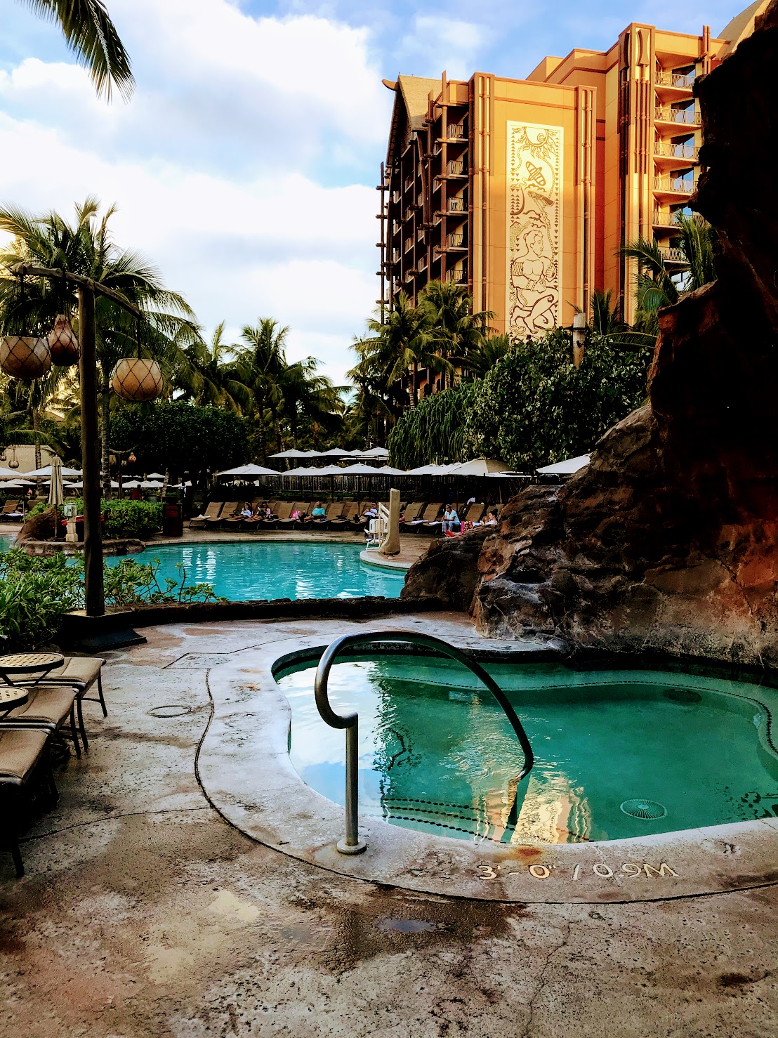 There are five hot tubs at Aulani. Two of the hot tubs are limited to guests age 18 and older. These are terraced, one looking down on the other over the infinity edge. They both have a commanding view of the ocean, making this a fabulous spot from which to watch the sunset. The other three hot tubs are distributed around the resort. One each near the Waikolohe pool, the Waikolohe Stream, and Ka Maka Grotto. There are no hot tubs near the Wailana pool.