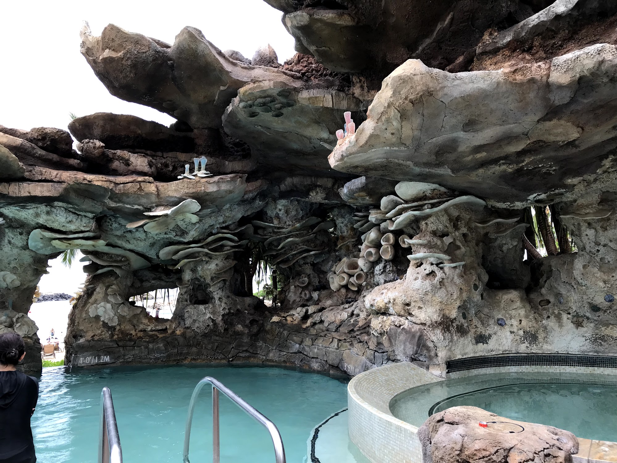 A stunning infinity pool with an attached hot tub tucked into a cozy grotto that is artfully lit up at night. If you go under the pool’s surface, you may hear a mischievous menehune giggling or the calls of passing whales.